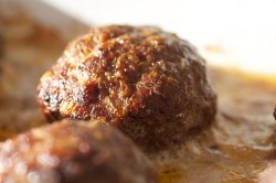 Mix onions into the meat. Add the lightly beaten egg till well combined. Sprinkle matzah meal into it, spoonful by spoonful mixing until you feel it holding together. Leave to ‘solidify’ for five mins. Once they are malleable, wet hands and roll balls of the mixture between your palms, making balls bit bigger than a golf ball. Sprinkle some meal onto a sheet of cling film or foil on the worktop and roll each ball over it – that makes them a little crispy when cooked.